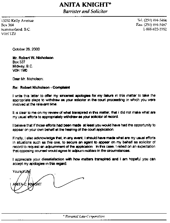 counsel who agreed to represent Nicholson's case. By her own written admission (confession), she