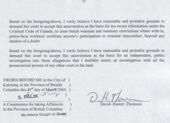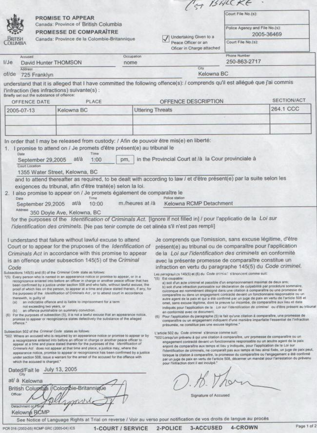 Please note the nature of the alleged offence, paricularily where this allegation came from that resulted in my arrest because, according to Constable Balke, I was "not co-operating in [his] 'investigation'". The resulting charge and subsequent "Undertakings" that I signed my name to, I did under much protest, duress, threat and intimidation, and in order to be released from jail...