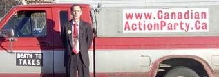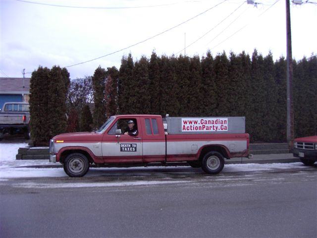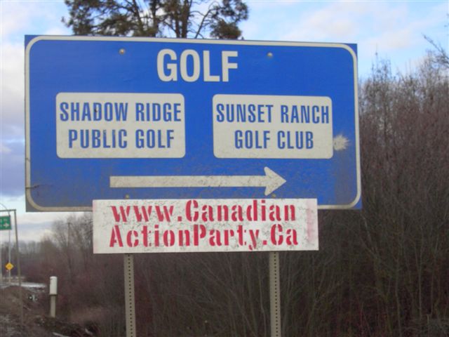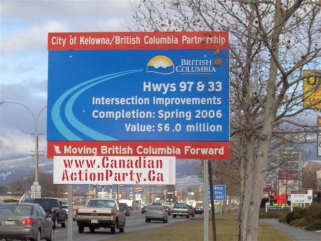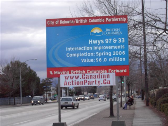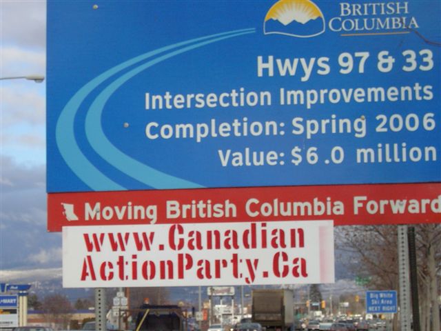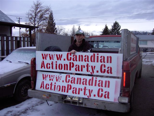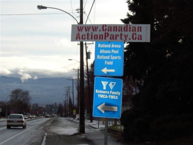 Campaign Signs for David Thomson Canadian Action Party Candidate for Kelowna-Lake Country ![]() January 8th, 2006. Happy New Year, one and all. May this new year be just the beginning of all the best that we can achieve, united in the name of Humanity. At this juncture in the road, Canadians must make some important decisions. We can either lead the world as a progressive nation, or we can fall into lock-step, marching into the dawn of this new millenium, "model corporate citizens". Janine, from UBC's Kelowna North Campus telephoned me the morning after I installed these signs, above, attached, inobtrusively to the top of the www.carpool.ca signs on each side of the road, one on the way up to the campus, the other on the way down. Janine explained to me that the campus security had torn the signs down. I tried to explain the spirit and intention of Section 81 of the Canada Evidence Act but she explained that she was not in a position to make any rulings herself, referring me to their security department who called me back, later that morning. Wade Bottorff called me back and told me that the signs were installed on "private property" and that further, the signs violate UBC's non-partisan policy. I tried to explain the spirit of Section 81 to Wade, also but it appears to have fallen on deaf ears. Wade did save the signs for me, though it appears as though somebody drove over them, perhaps. The corrugated plastic was crushed where the paint was missing. I tried to paint them over but it turned out a bit messy where they were crushed. My biggest dissapointment is that those signs were torn down before my intrepid photographer was able to capture images of those particular signs. Another sign (sorry, no picture), stapled to the "Moving British Columbia Forward" sign, right under the lights, turning off Hwy 33 onto 97, took a hit but recovered from the mud and returned to service. Last to be seen on KLO Road, across from the O.K. College, South Campus facility, since, Missing in Action, shortly there-after. The city of Kelowna has been taking my signs. To the best of my knowledge, I have only 3 signs left up, down from about 20. I've grown accustomed to my being the target of ignorance and abuse but it's still disappointing to see our fundamental values, continually being eroded and trampled on by those combined and singular efforts of "model corporate citizens", a product that UBC recently admitted, they were proudly producing. Still, I have not lost faith in humanity.